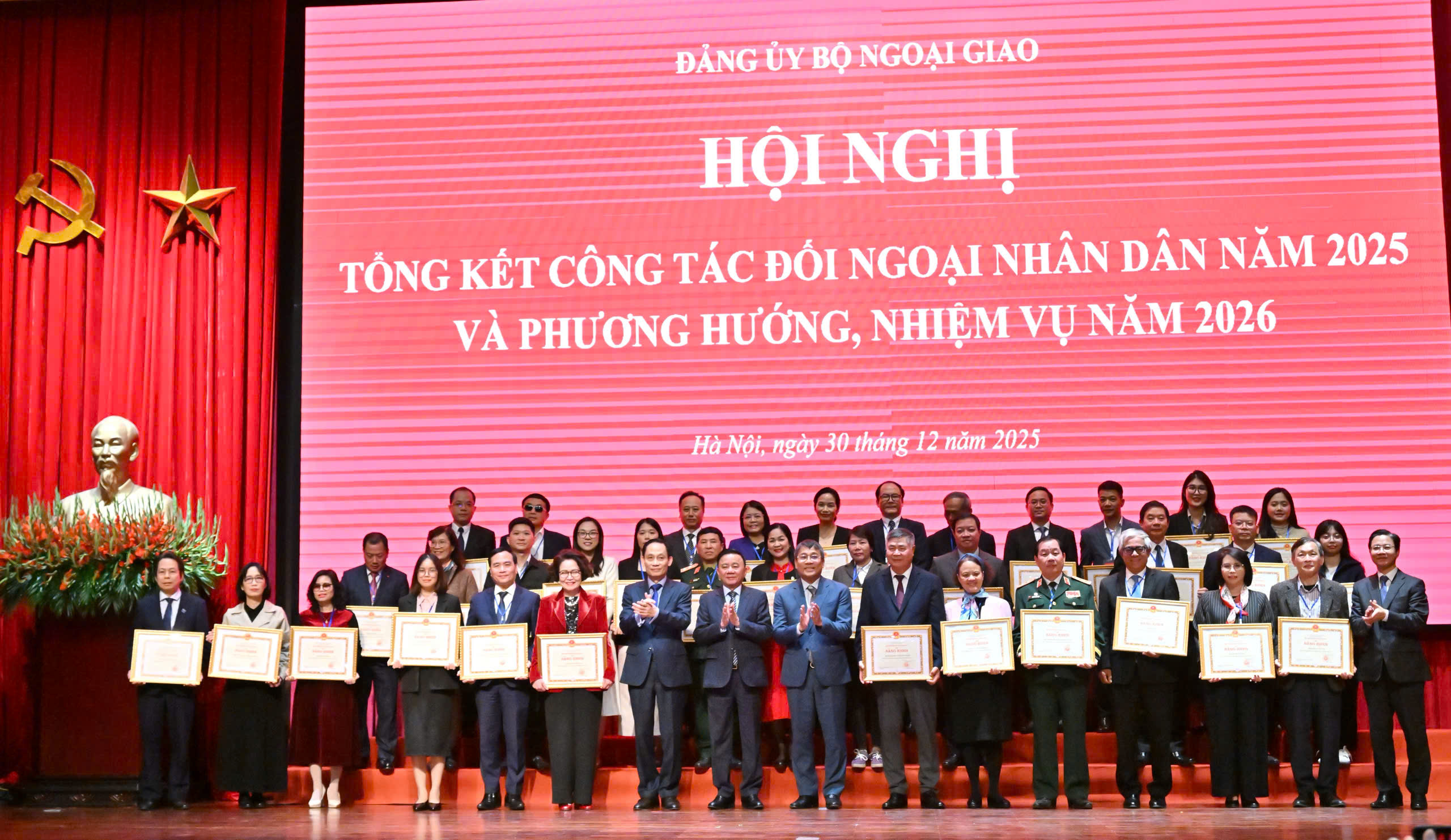 Nhân dịp này, Bộ trưởng Lê Hoài Trung và Thứ trưởng Thường trực Nguyễn Minh Vũ trao tặng Bằng khen của Bộ Ngoại giao cho 27 tập thể và 12 cá nhân có thành tích xuất sắc trong công tác đối ngoại nhân dân.